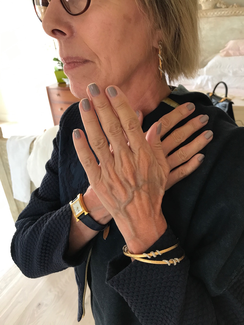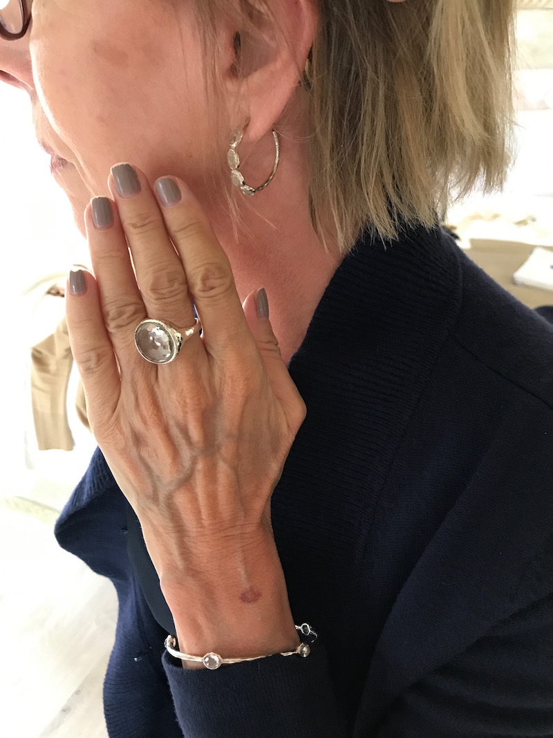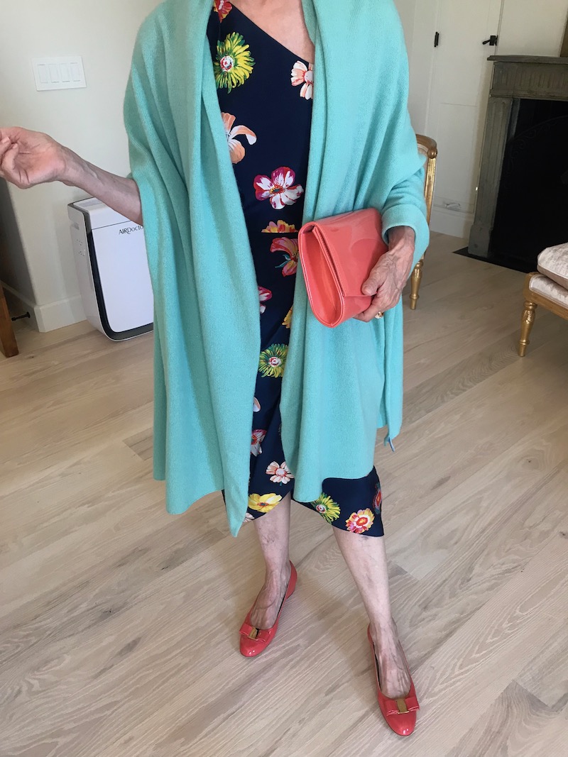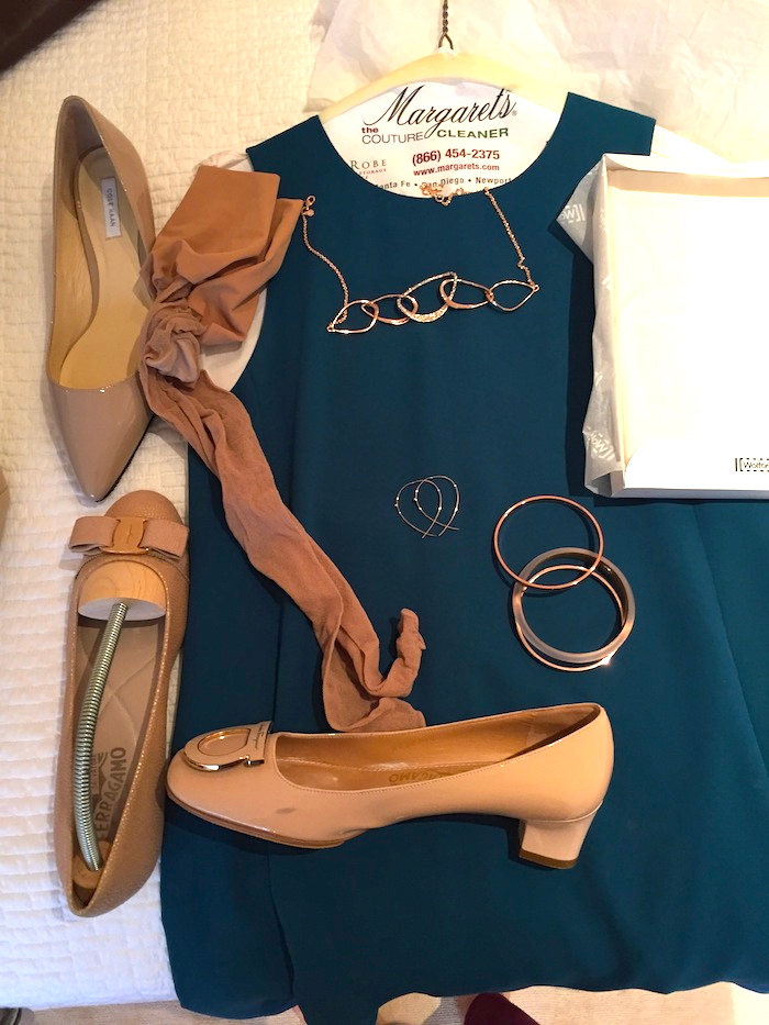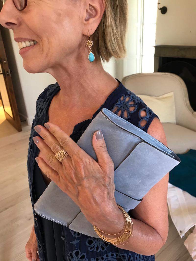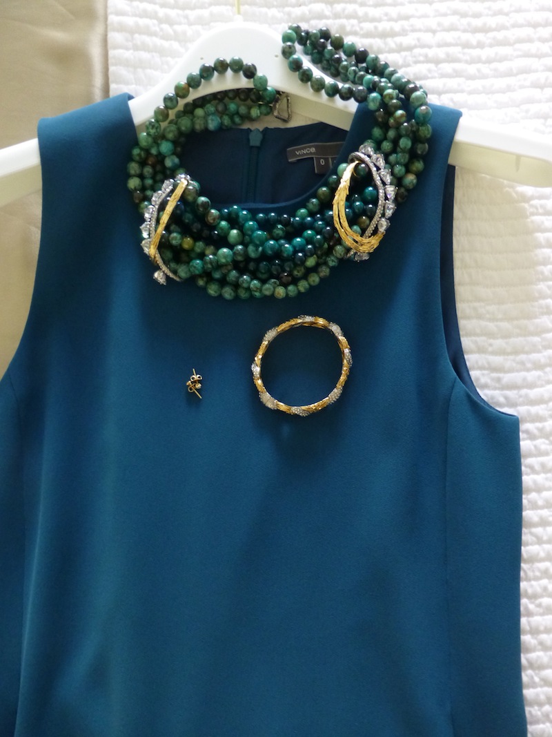 Jewels: “Argento Vivo” gold lattice earrings or chunky gold earring, delicate gold bangles, “Argento Vivo” gold fleck ring or “Alexis Bittar” turquoise cocktail ring