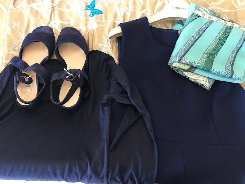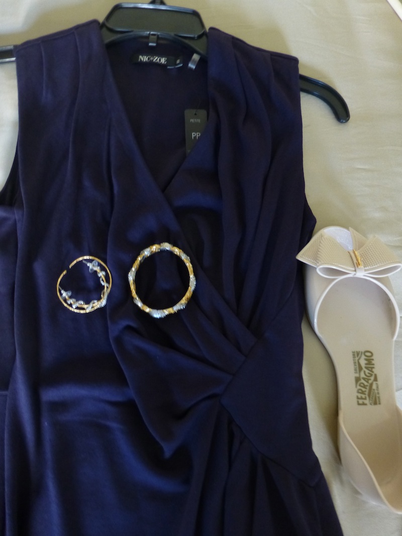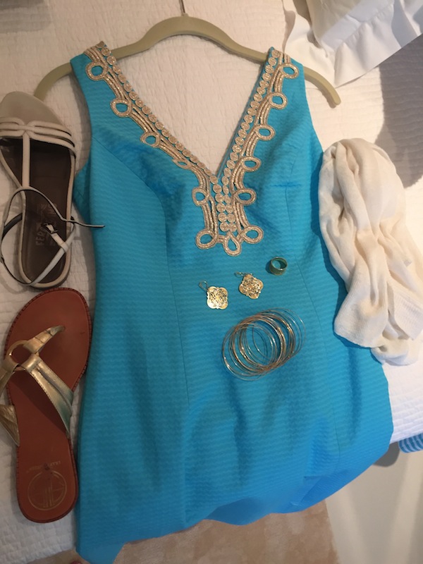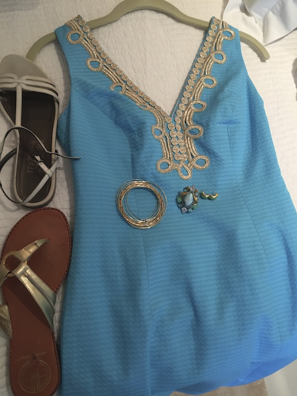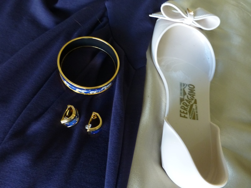 Shoes: “Salvatore Ferragamo” white leather sandals or “Lilly Pulitzer” gold sandals