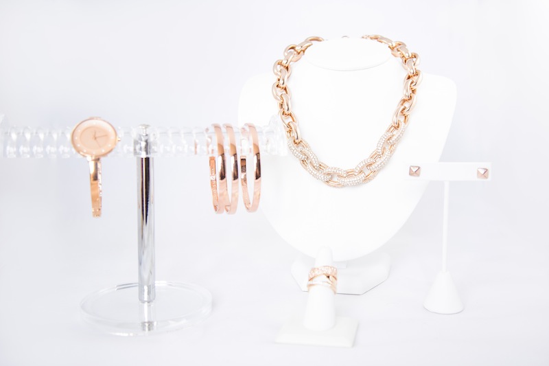 Jewels 2: “Nordstrom” rose gold and pave crystal chain link necklace, “Michael Kors” rose gold ring, rose gold pyramid studs