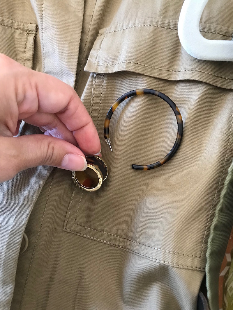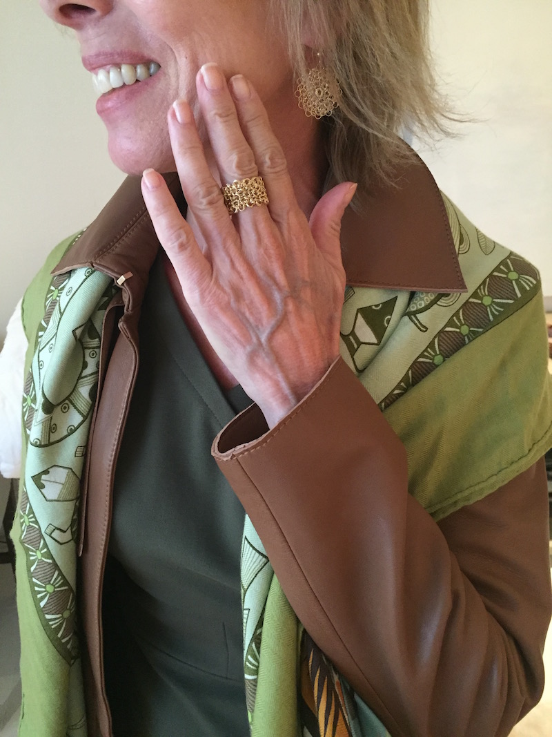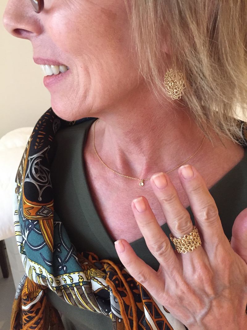 Jewels: gold thin chain neckalce, “Miriam Jewels” gold weave rop earrings, “Miriam Jewels” gold weave and stone drop earrings, Miriam Jewels” gold weave ring