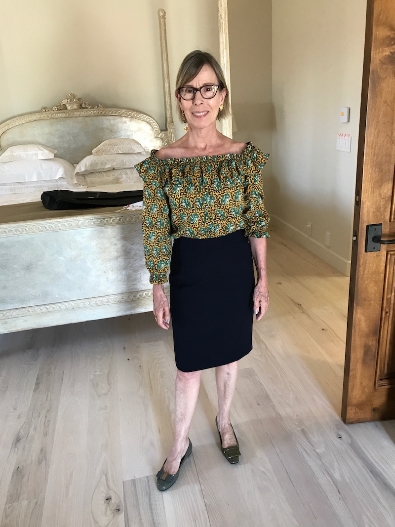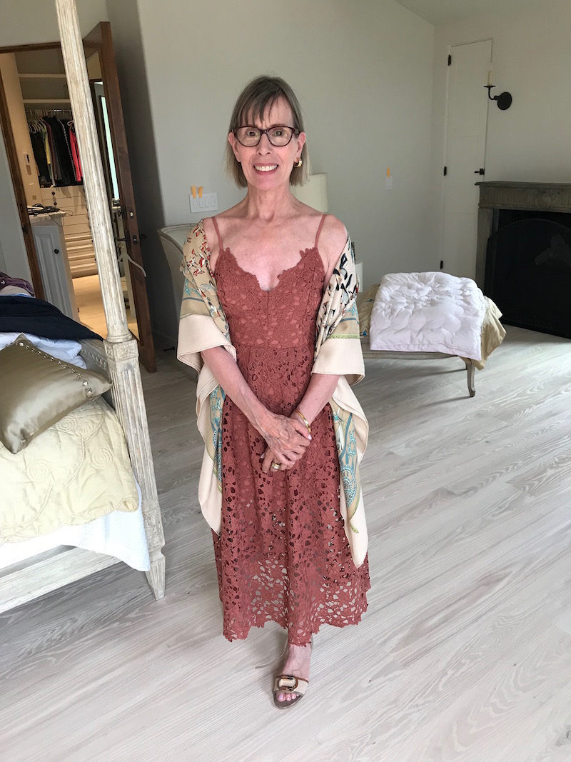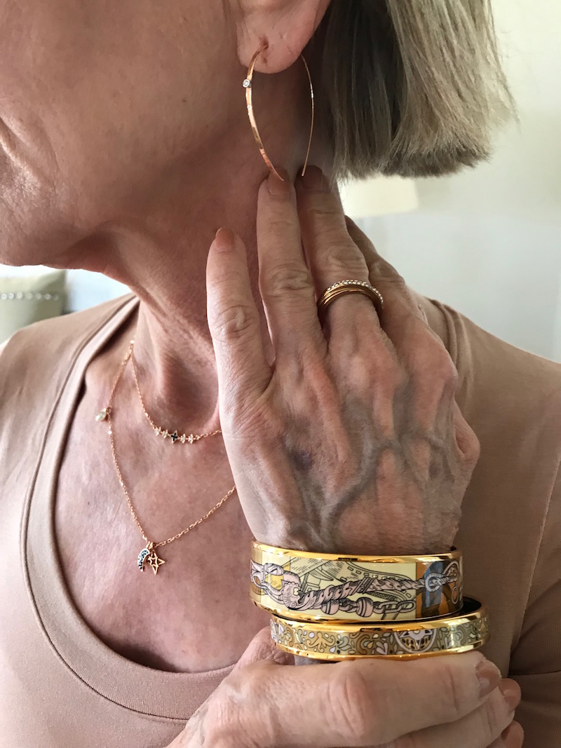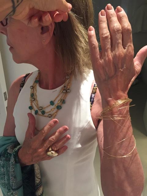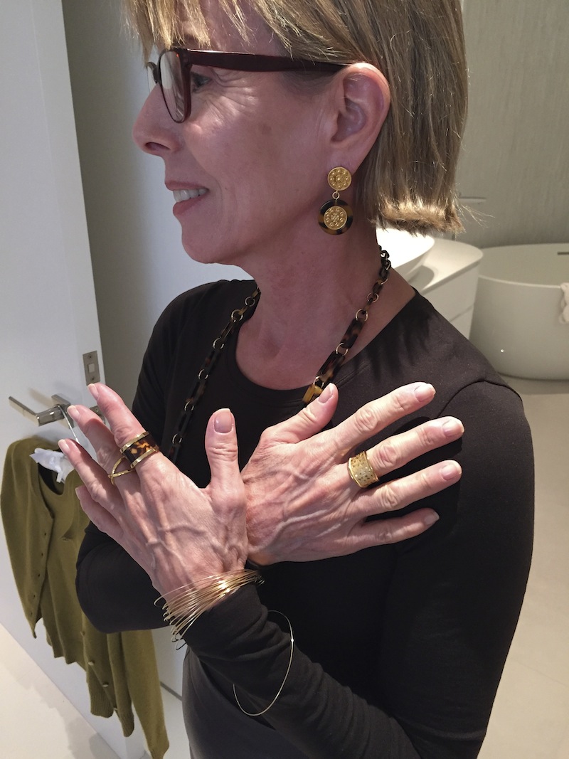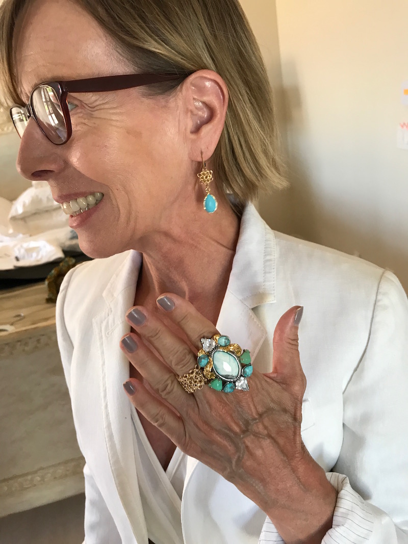Jewels: “Argento Vivo” gold lattice earrings or chunky gold earring, delicate gold bangles, “Argento Vivo” gold fleck ring or “Alexis Bittar” turquoise cocktail ring