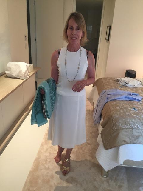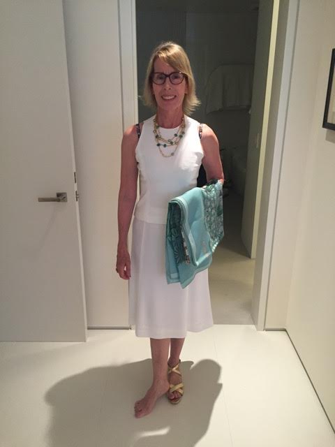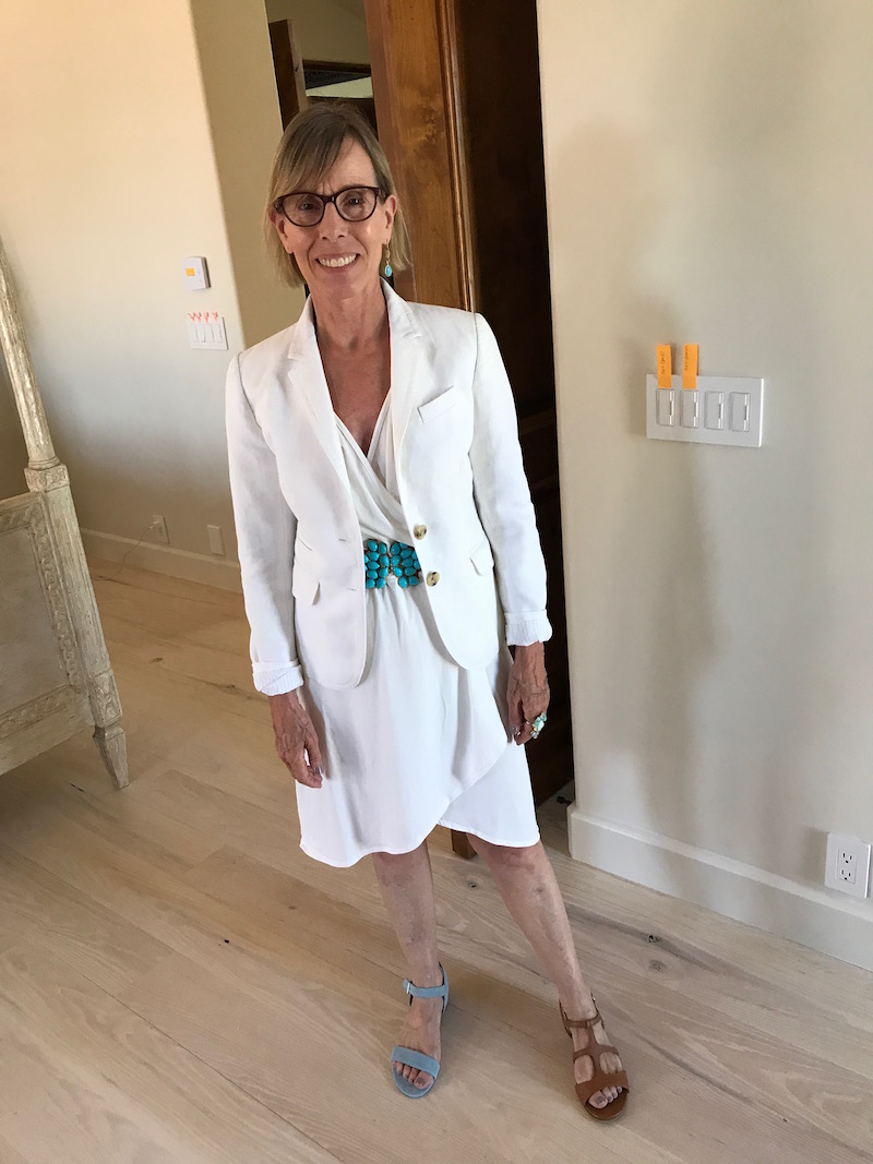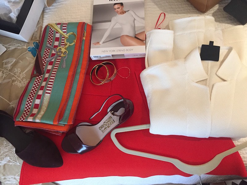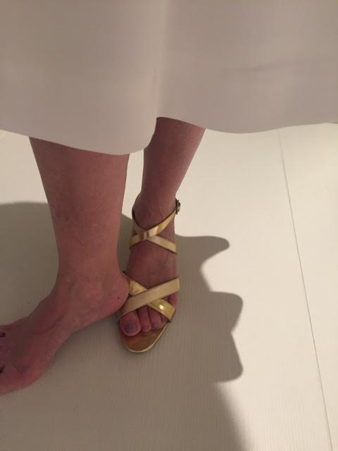 Shoes: “Salvatore Ferragamo” white leather sandals or “Lilly Pulitzer” gold sandals