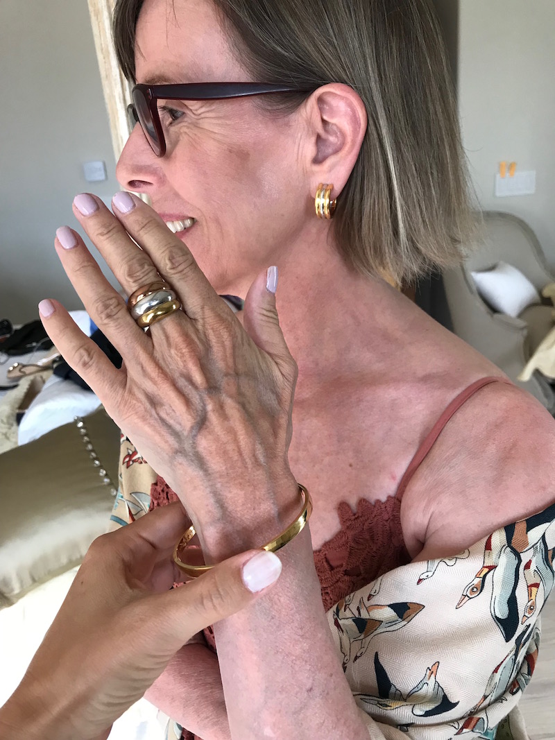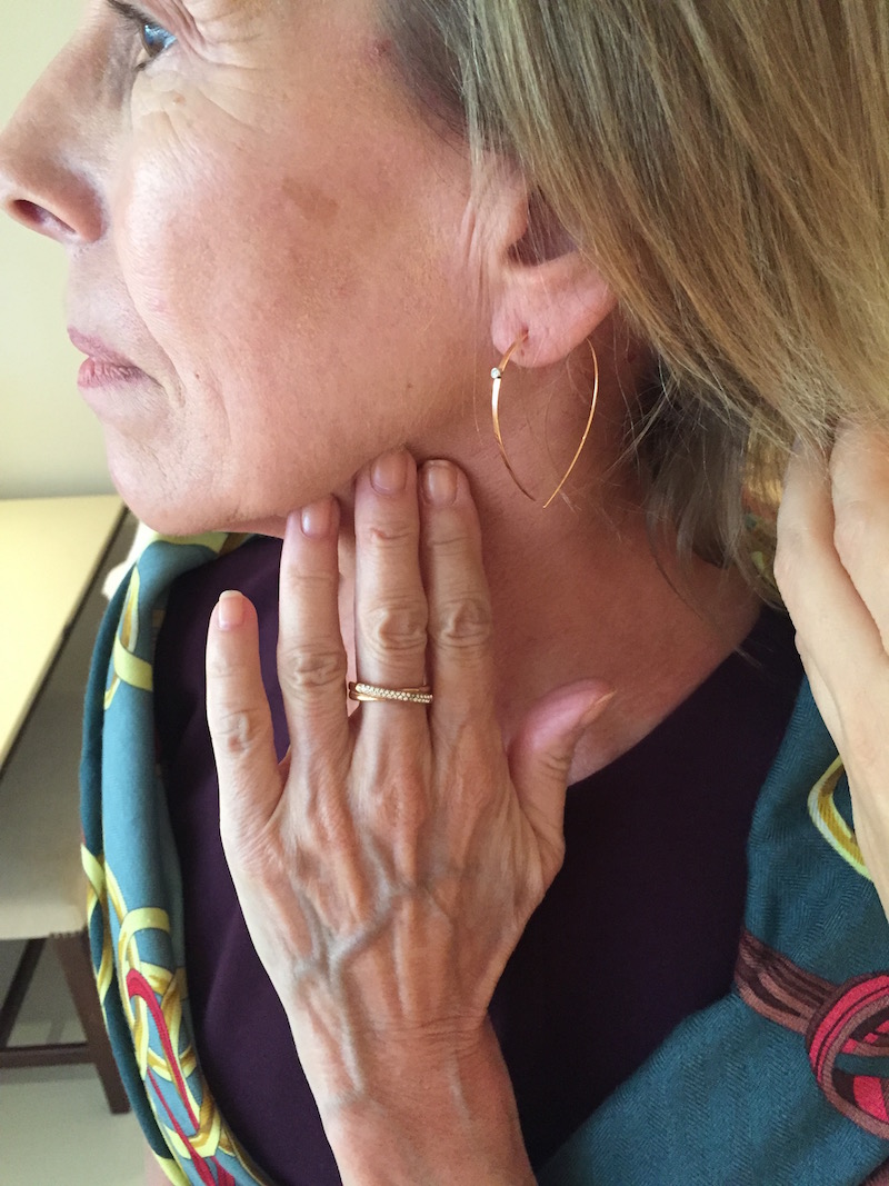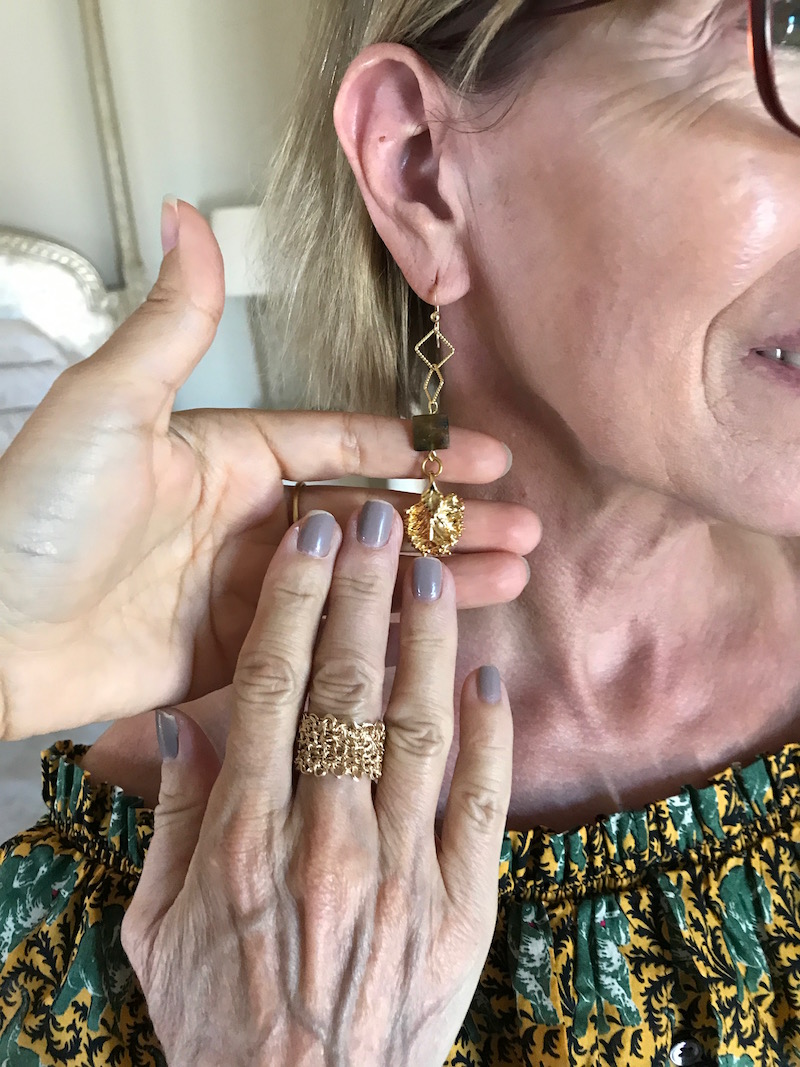 Jewels: gold thin chain neckalce, “Miriam Jewels” gold weave rop earrings, “Miriam Jewels” gold weave and stone drop earrings, Miriam Jewels” gold weave ring