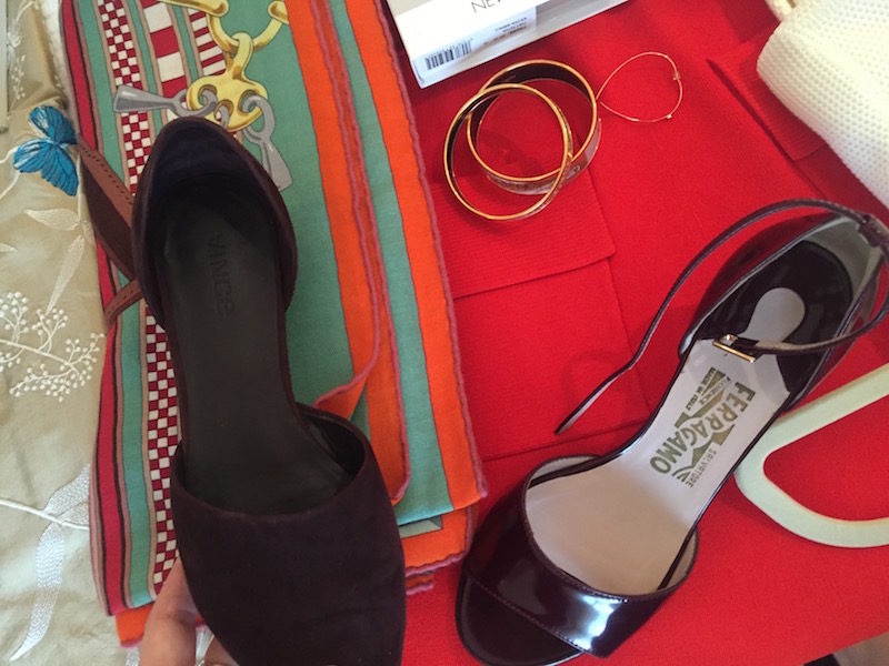 Shoes: “Cole Haan” nude patent leather pointy toe flats, “Salvatore Ferragamo” navy blue patent leather heels, “Oscar de la Renta” tan/yellow reptile pointed toe flats