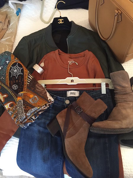 “Worth” Orange Long Sleeve Shirt, “Kate Spate” Olive Green Leather Skirt