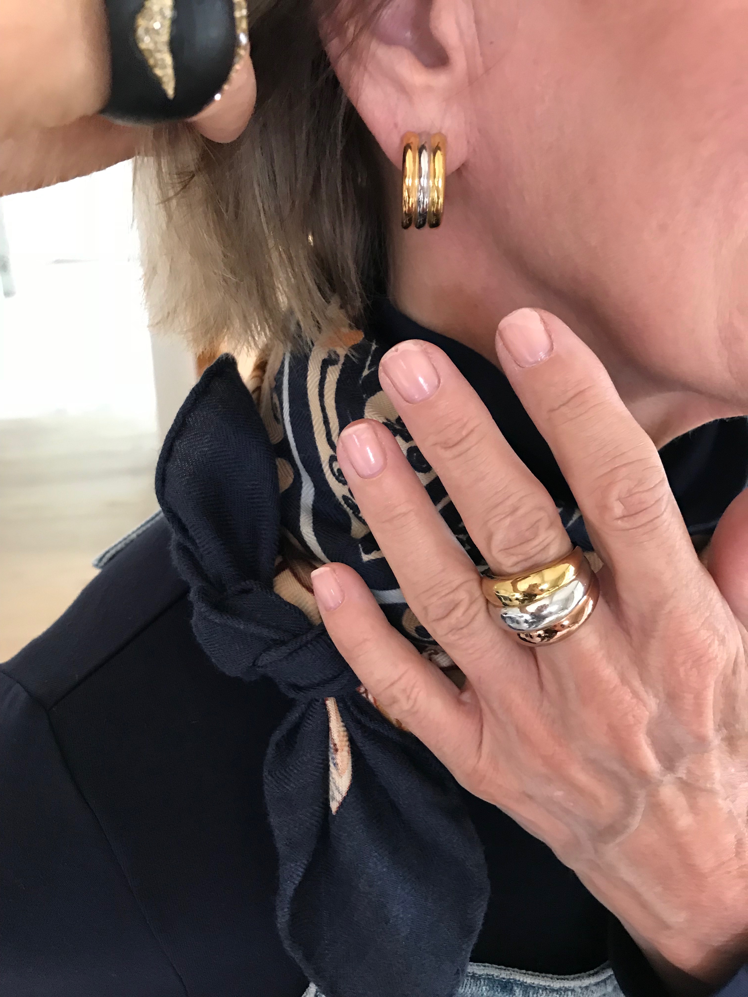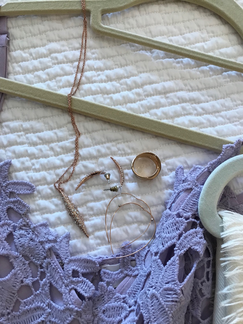 Jewelry: rose gold and crystal pendant necklace, rose gold and crystal claw stud earrings, rose gold bar dangle earrings, rose gold ring, gold stud earrings, gold dainty necklace