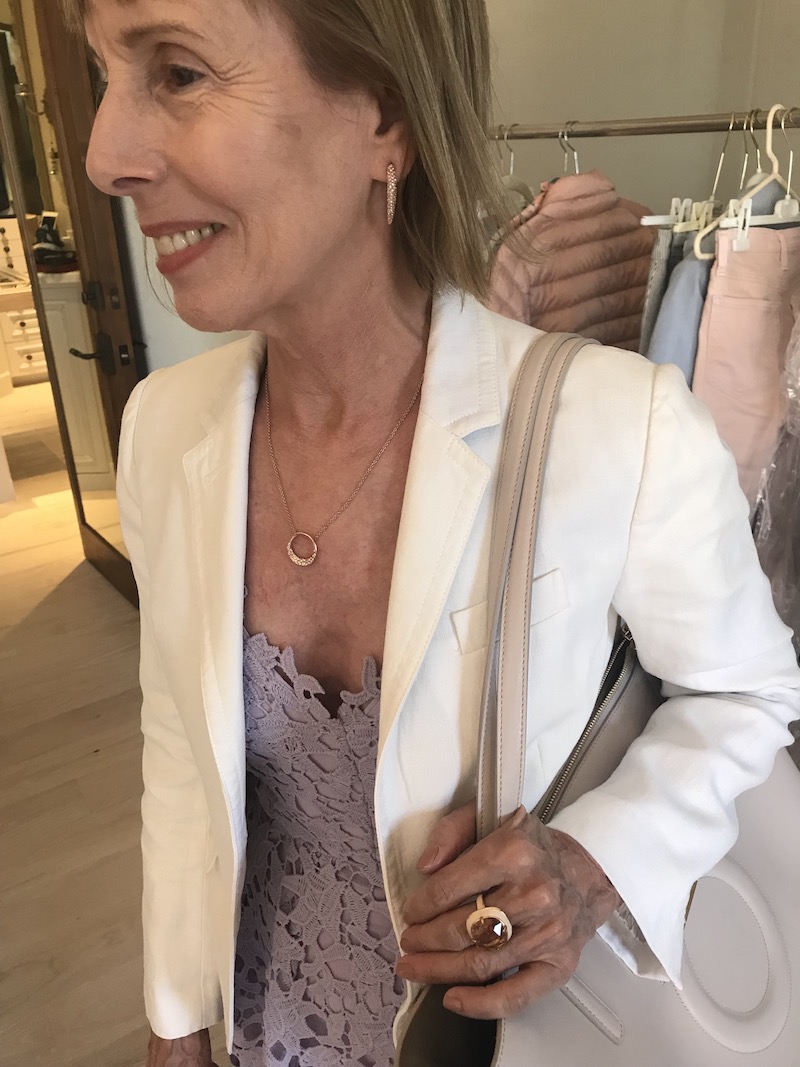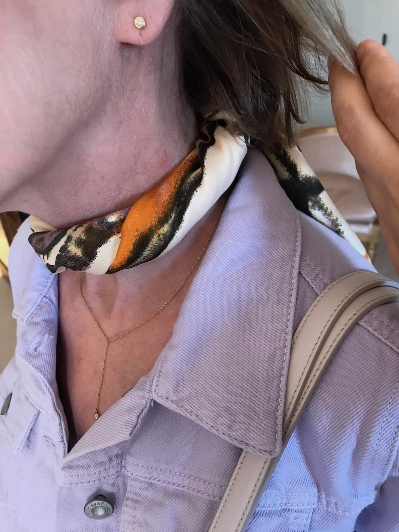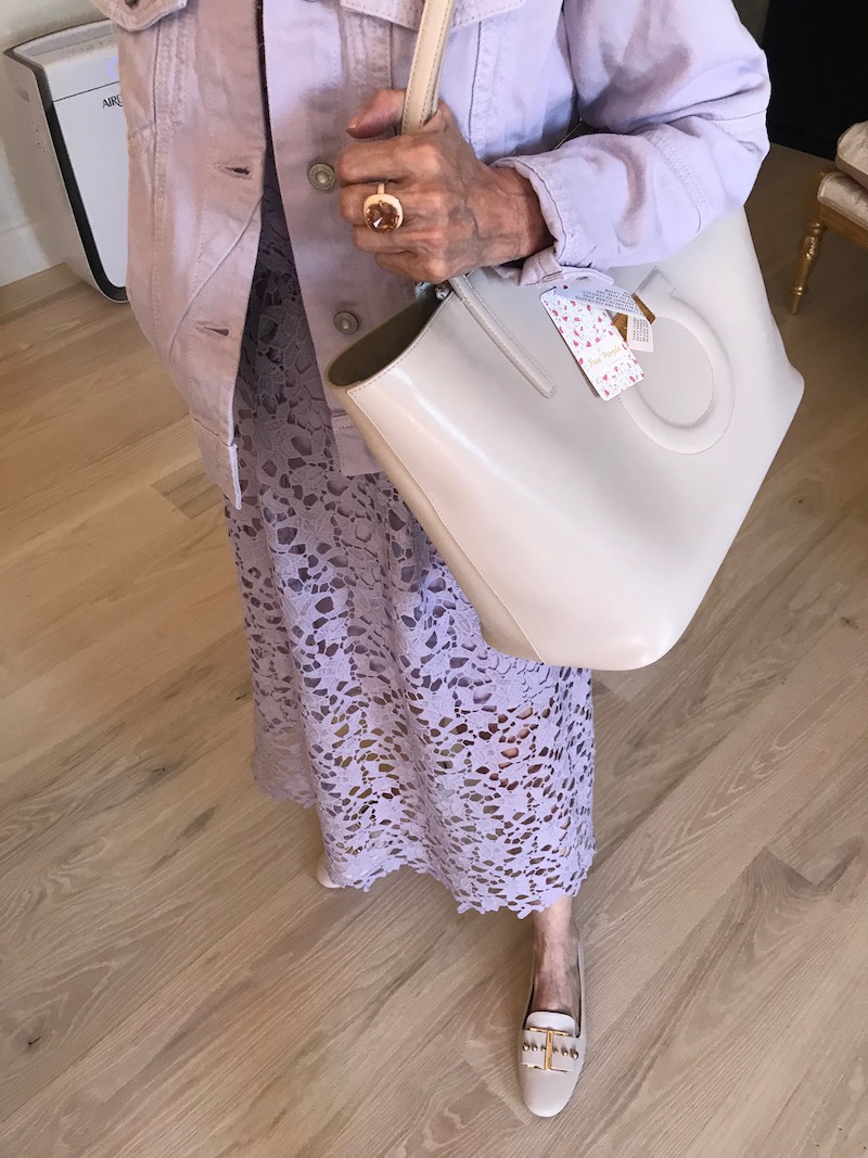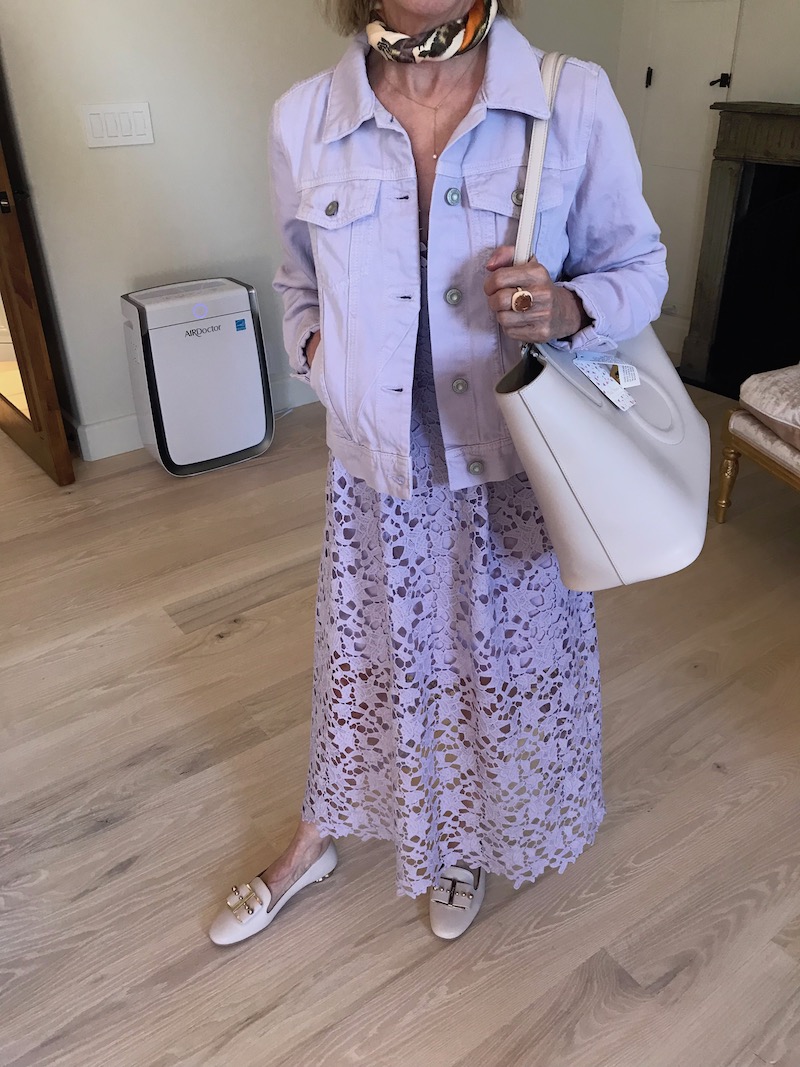 Cover Up: white scarf, “J.Crew” white blazer, “Free People” light purple jeans jacket