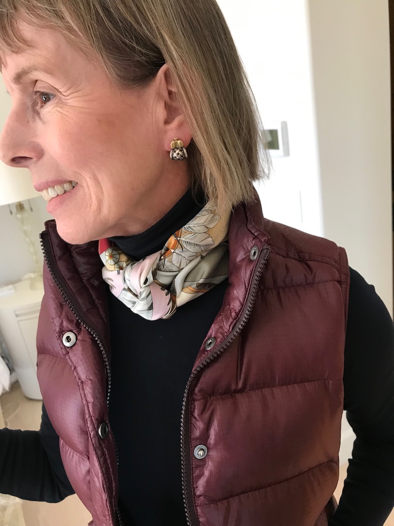 “Joie” Biege Ruched Top, “Paige” Dark Blue Jeans
