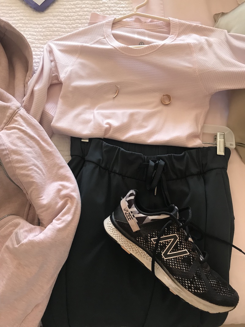 “J.Crew” Light Pink Short Sleeve T-Shirt, “Lululemon” Navy Blue On The Fly Pants