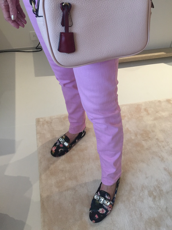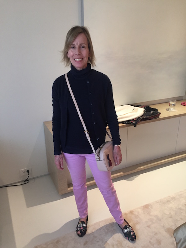 “Caslon” Navy Turtleneck Top & “J.Crew” cashmere vest, “Lily Pulitzer” Pink Jeans Leave a reply Jewels: “Lana” rose gold hoop earrings, rose gold ring, rose gold watch Cover Up: “J.Crew” navy blue button up cardigan Shoes: “Seychelles” navy blue floral print flats w/ faux diamonds Purse: “J.Crew” blush square cross body