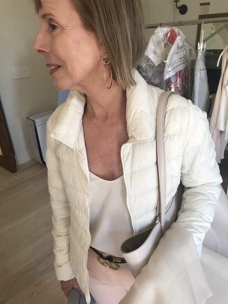 Cover Up: white scarf, “J.Crew” white blazer, “Free People” light purple jeans jacket