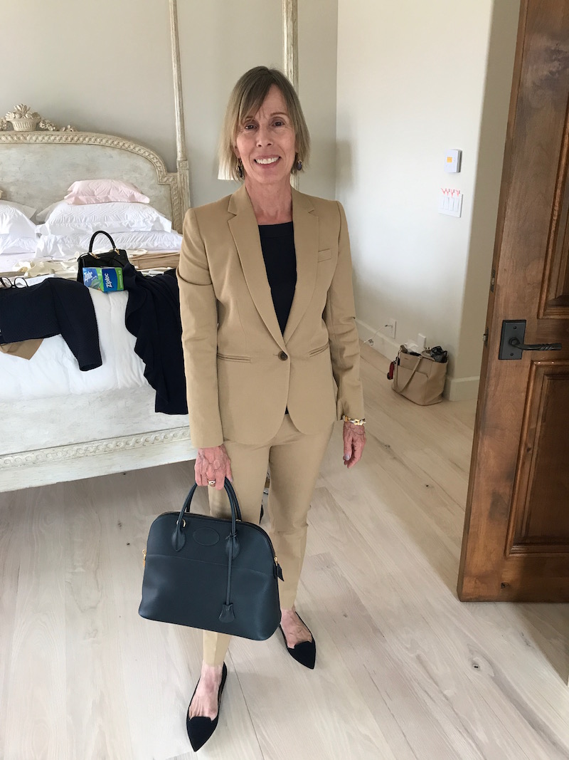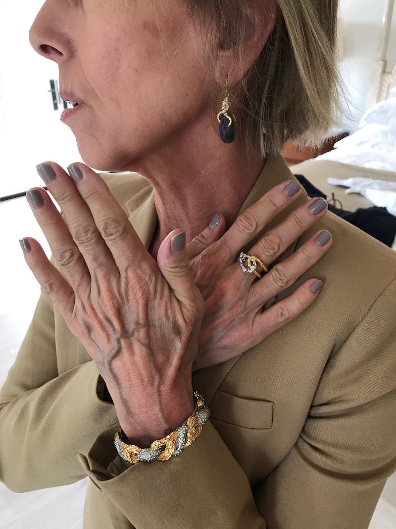 Jewels: “Hermes” stacked white and gold bangles, “Marco Bicego” yellow gold balls hanging from delicate gold chain earrings