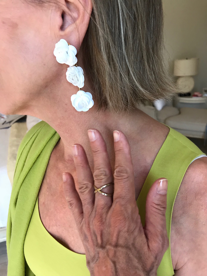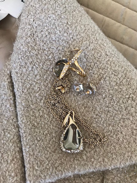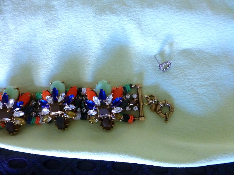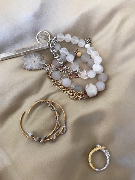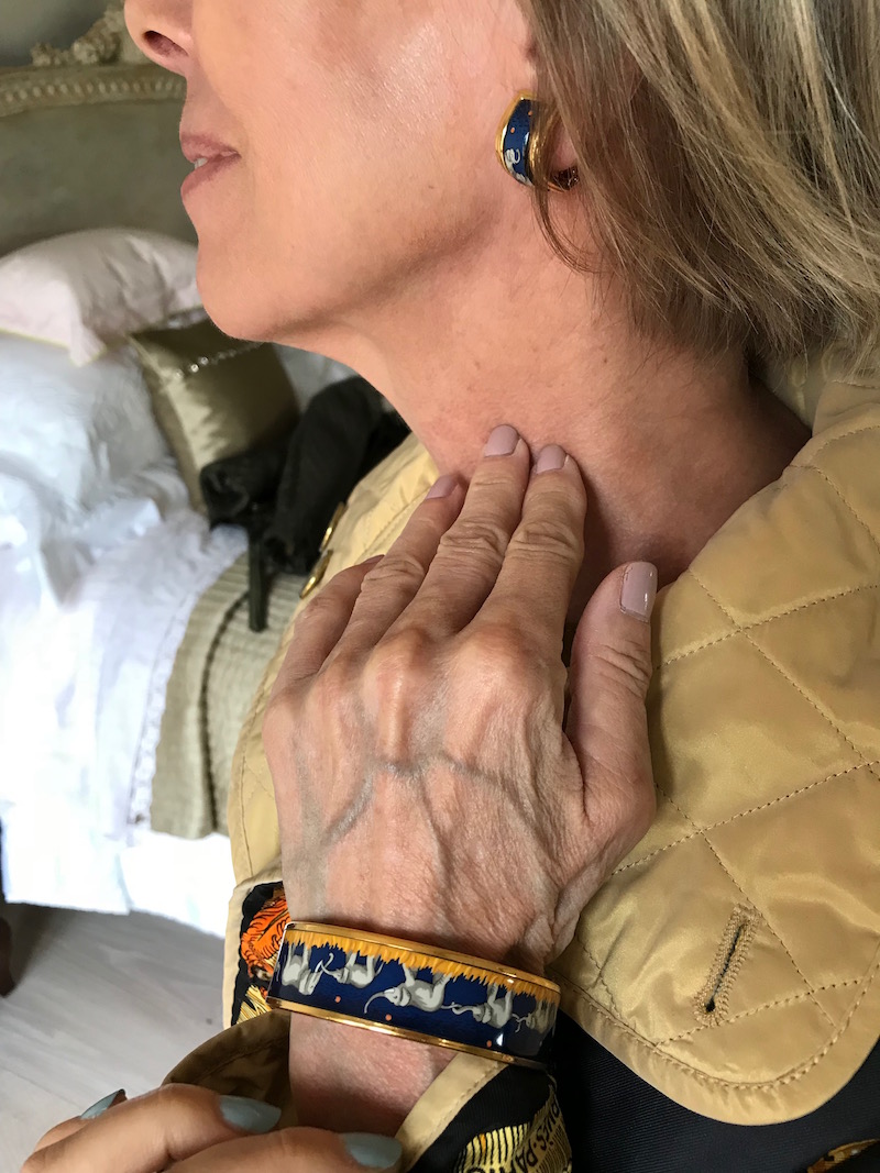 Jewels: simple gold earrings, stacked “Hermes” bracelets