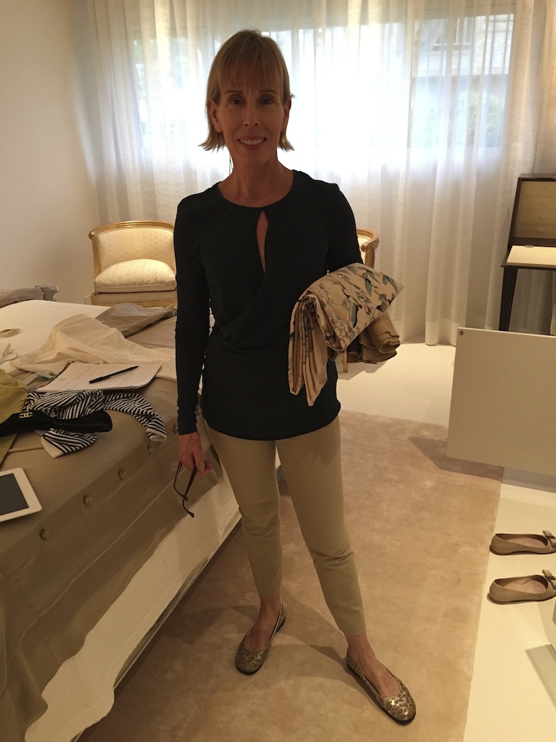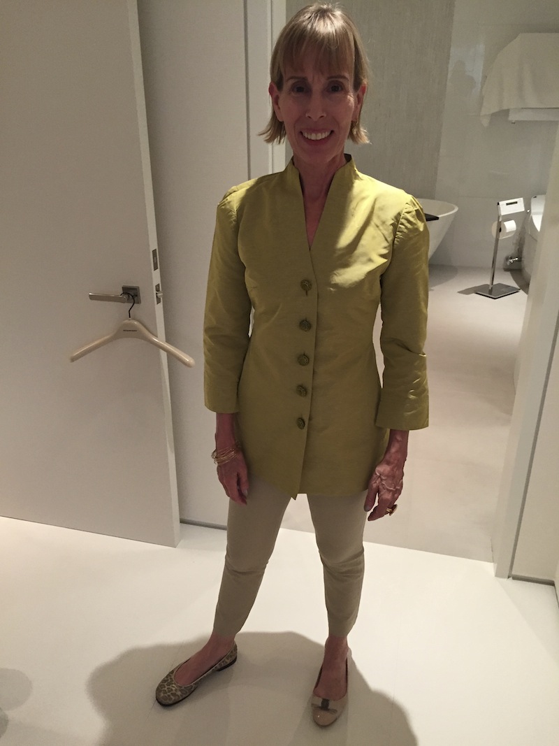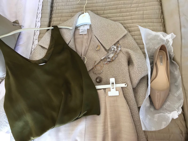 “Phillip Lim” Olive Green Sleeveless Blouse. “Akris” Beige Mid-Length Skirt