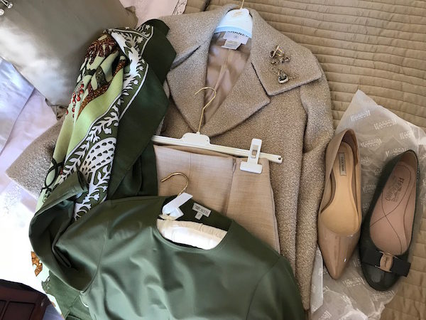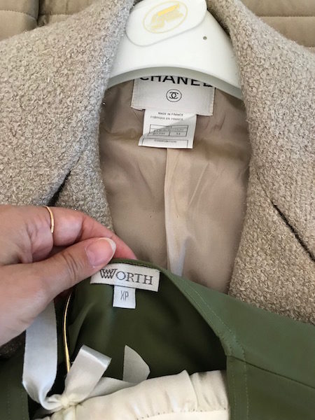 “Worth” Olive Green 3/4 Sleeve Top, “Akris” Beige Mid-Length Skirt