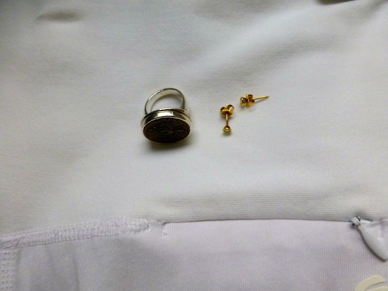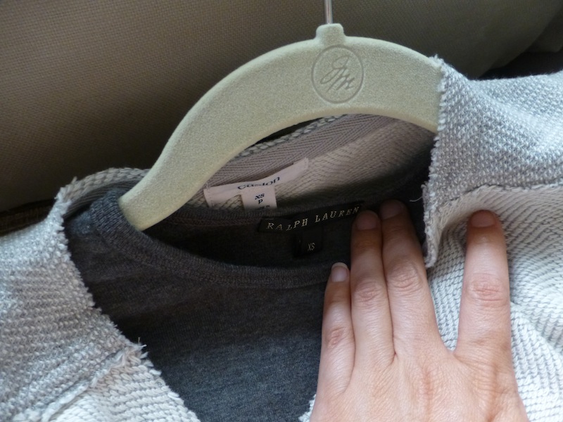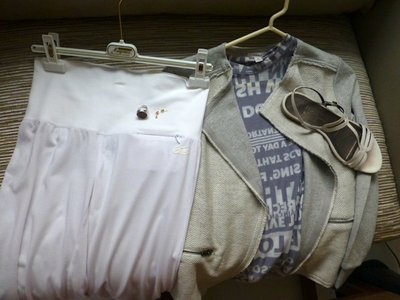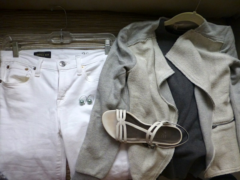 “Ralph Lauren” Grey L/S Crew Neck Cotton Tee, White Jeans Leave a reply Jewels: hanging pewter large pearls, mixed metal ring Cover-Up: “Caslon” grey and white sweatshirt blazer Shoes: “Salvatore Ferragamo” white strappy sandals